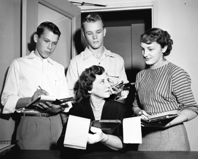 Each, year the Fort Worth school system's field of distributive education attracts more and more students. Miss Edith Hudson, seated, co-coordinator at Polytechnic High School, shows students how to fill out a sales slip. Left to right are, Loyd Bohannon from Amon Carter Riverside, Jimmy Cartwright from Paschal, and Jackie Ayer, from Arlington Heights.