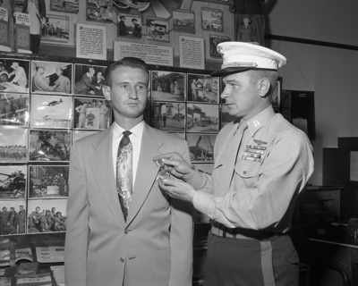 Marine Lieutenant Robert P. Smith, left, Texas Christian University (TCU) student from Edinburg, receives the Air Medal from Captain J. F. Williams of Dallas.