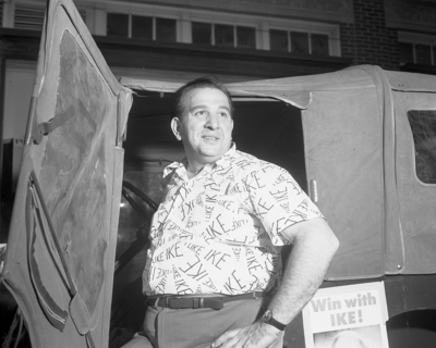 Marty Snyder wearing "I like Ike" shirt and standing against a car.
