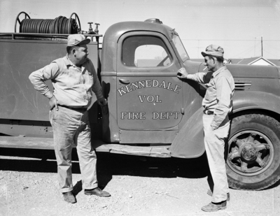 Kennedale Fire Chief Mortie Peterman, left, and Assistant Chief W. W. Gillespie admire the fire truck which citizens built from a $600 truck. Published in Fort Worth Star-Telegram evening edition April 6, 1950.