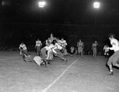 Doyle Traylor, star of the Temple attack, is swarmed by Arlington Heights tacklers after a three-yard pickup in the game at Farrington Field. The Wildcat ace played a spectacular game. Published in Fort Worth Star-Telegram morning edition October 11, 1952.