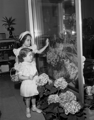 Susan Jane Rhodes, left, wearing a pink zephyr cotton dress with gray cutwork trim, and Linda Hutchinson, in a pink embroidered organdy. Clothes are Susan Jane originals created by Mrs. W. G. Griffing of Fort Worth. Published in Fort Worth Star-Telegram morning edition April 9, 1950.