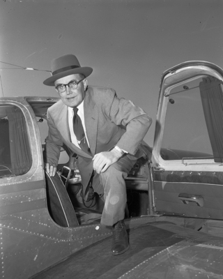 Dr. George Cross, University of Oklahoma president, after landing in Fort Worth for football game. He died in Norman, Oklahoma on December 31, 1998. He was a beloved president of OU which he carried the title for twenty-four years of service. He died at the age of 93 years old.