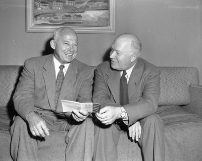 Seated in a sofa are George Sawtelle, left, of Houston, and Frank M. Porter, president of American Petroleum Institute.