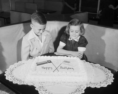 In this picture Dick Gately and Carol Lee Harris, look hungrily at an Eisenhower birthday cake served on Eisenhower's birthday.
