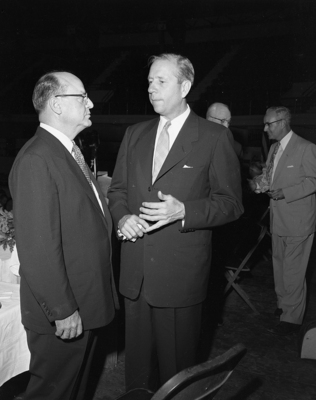 Standing in a room are Frank Kent, left, and John S. Bugas.