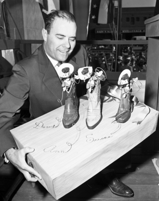 Tom McCann, chairman of arrangements for the Eisenhower visit here, inspects the gift wrapped cowboy boots and toys which were gifts of Tarrant County Republicans to the general's grandchildren, David, Ann and Susan.