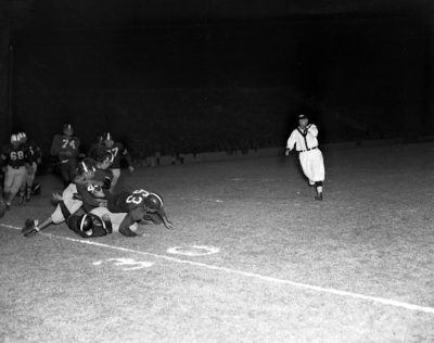 Julio Laguarta, Texas Christian University Wog quarterback is brought to a halt after a 10-yard gain by the Aggie freshmen's Duane Nobles in the first period of the game at Amon Carter Stadium. The Wog in the foreground is Charles Bell (53). Published in Fort Worth Star-Telegram morning edition October 16, 1952.