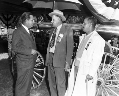 Featured at the attractions of the second biennial Permian Basin oil show at Odessa were Thursday's parade and manufacturers' exhibits at Ector County Park. In the picture left to right, Fulton Lewis, Jr., W. D. (Bill) Lane, and Carlos Clover.