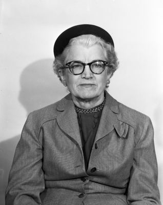 Miss Audrey Van Sandt is director of what she terms the "headache" department at Rowan Oil Company. Her job is supervising the lease rental payments and the details involved in being sure the rentals are paid correctly and promptly to avoid losing leases. Miss Van Sandt is wearing a dark blouse with beads in the neckline, a coat, hat and eyeglasses.