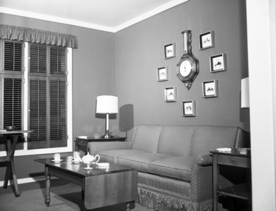 There's not a false note in the harmony created in the living room of the J. Bobby Byrne home. Red, green, and the rich tones of antique finish maple combine to make a warm and hospitable living area. There is matching fabric of the sofa and valances. The sofa is flanked by identical side tables and lamps. On the wall is a clock surrounded by small frames of antique cars.