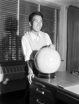 A 20 year old South Korean youth started classes at TCU last Thursday the same day that his brother, a June TCU graduate left San Francisco for his homeland. Daesook Suh arrived in Fort Worth for a year of the education that his brother, Whasook Suh had written him he needed to "help Korea." Daesook smiles as he points to a globe in front of him.