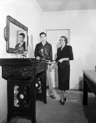 Household treasures of older years give pleasure to many today, and in another era, articles which now are commonplace will be collectors' items. Many such articles, coveted by modern collectors, will be exhibited October 21-24 at the Woman's Club Annual Antiques Show. A rare old teak wood Chinese altar serves as a buffet in the home of Mrs. G. E. Cranz, Jr., and sets the decor of the dinning room. Pictured with her is her younger son, John Cranz.
