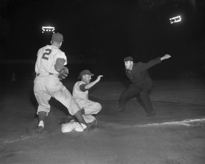 The Fort Worth Cats' Francis A. Brown slides safely into third base under a throw from Eddie (Duke) Snider in third inning of the night's game at La Grave Field.