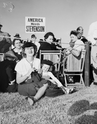 Mrs. George M. Murphy of Rt. 10 and her daughter Pamela. They came to hear the Democratic presidential nominee Adlai Stevenson at the Will Rogers Memorial grounds. Mrs. Murphy is passing the time by knitting. An estimated 6,500 persons came out to support Stevenson.