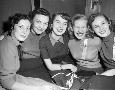 Arlington beauties riding the special train to Terrell Friday night included left to right, Lila Albright, Dorothy Bardin, Dolores Bardin, Jannette Fitzgerald and Connie Bass. Miss Albright, recent resident of Connecticut, was surprised at the enthusiasm shown by Texas high school football fans. Two girls are wearing "AHS Colts" ribbons.