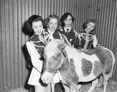 Getting plenty of attention on the special train from Arlington to Terrell was "Little Arlie" mascot, a dapple and white Shetland Pony, of the team. Left to right are Jane Wood, majorette; Frances Webb, Harriet Slaughter and Shirley Hoffman.