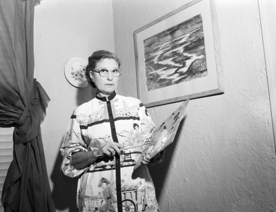 Mrs. Maudie Hawkins hangs a water color called, "The Lake of the Ozark" which passed a Texas Fine Arts Association jury last year and was displayed in the Elizabeth Ney Museum in Austin. Mrs. Hawkins will teach an oil painting course for the YMCA. Mrs. Hawkins is shown holding a paint brush and palette and is wearing a dress with Asian inspired design.