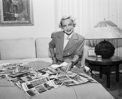 Mrs. Ted Samosch, will sail Nov. 7 from New York on the SS Independence for Gibraltar, Cadiz, Malaga, and then to Barcelona, where she will see her mother for the first time in 14 years. She will spend two months in Majorca, then go to San Sebastian Isle of Capri, Italy and France. There are many travel brochures spread out on the bed in front of her.