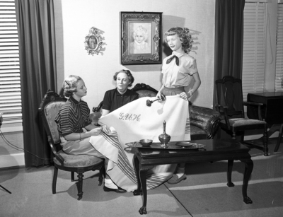 Household treasures of older years give pleasure to many today, and in another era, articles which now are commonplace will be collectors' items. Many such articles, coveted by modern collectors, will be exhibited October 21-24 at the Woman's Club Annual Antiques Show. Pictured with Mrs. James C. Simmons, center, are her daughters Janiece, right; and Charlotte Johnson, left. They are looking at a blanket and door knob from the old Grand Union Hotel in Saratoga Springs, New York.