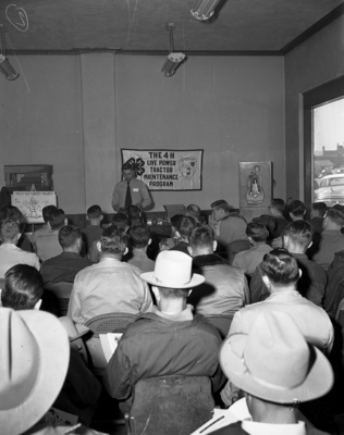 Ranch and Farm Magazine on the 4-H boys in Wichita County. Older 4-H boys, farmers, and county agents from over Texas take part every year in a series of tractor maintenance schools. This photo made at a recent school at Childress shows Extension Agricultural Engineer W. L. Ulich conducting a class.