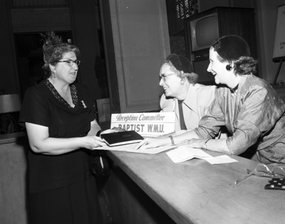 Mrs. R. W. Mitchell of Phillips, left, president of Palo Duro Association of Woman's missionary Union, an early arrival at Hotel Texas reception desk, was greeted by Mmes. J. M. Kane, center, and Mack Taylor, both of Broadway Baptist Church who are on reception committee for statewide Baptist meeting.