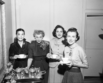 TCU exes and their families who attend the university's homecoming will be entertained at a coffee from 9:00 a.m. to 11:00 a.m. that day in Waits Hall, with TCU Women Exes Club serving as hostess. Left to right, Mmes. A. L. Strother, club president, Gayle Scott, Bryan Hanley, Jr. and John Pass, Jr.