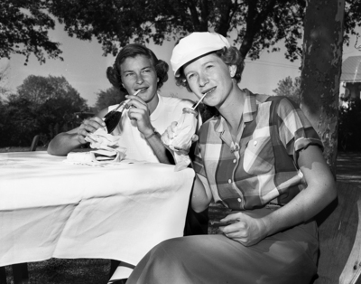 Beverly Hanson, left, and Marilynn Smith relax after qualifying in Women's Texas Open at River Crest. Published in Fort Worth Star-Telegram evening edition October 21, 1952