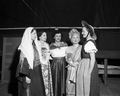 Five of the women who answered the roll call of nations at the Baptist General Convention of Texas foreign mission program Tuesday night. Left to right, Mrs. T. A. Patterson, Beaumont, representing the Near East; Mrs. E. H. Pierce, Corpus Christi, Hawaii; Mrs. H. C. Garber, Lometa, Chile; Mrs. H. C. Wigger, Santa Anna, Africa, and Mrs. Miller Reid, Blooming Grove, Switzerland. The women are wearing the national costumes of the countries/states that represent their mission field.