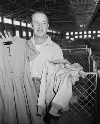 Jack Newell displays the quality clothing his committee wants to use to help needy school children in Fort Worth.