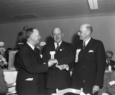 Plaques for outstanding service in oil and water conservation were awarded by the West Texas Chamber of Commerce to Railroad Commissioner Ernest O. Thompson; Joe S. Bridwell, Wichita Falls operator and rancher, and J. B. Thomas, president of Texas Electric Service Company, shown left to right. The men are congratulating each other.