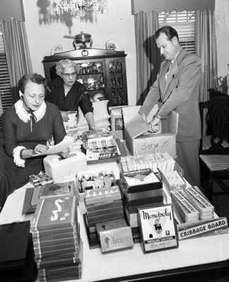 Mrs. Leo Lederman, Mrs. Ben Rosenthal and Jack Sten are shown, left to right, checking and packing a box of articles needed by service men. Boxes are sent monthly by members of the Armed Services Committee who are assisting the serve in a chaplain program. Some items they are packing are board games, puzzles, pillows and magazines.