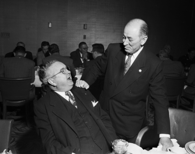 Gathered at the speaker's table at a Chamber of Commerce dinner in honor of Johns-Manville Corporation are rear, left to right, W. R. Wilkinson, Robert K. Hanger, Robert C. Simmons, Web Maddox and A. K. Higbee, and, front, Amon Carter, Left and Leslie H. Cassidy.