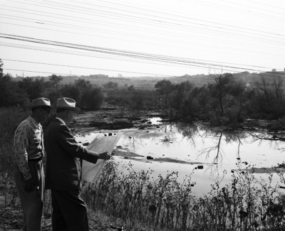 This swamp area will be a beauty spot when the African American municipal golf course is completed. City Recreation Director R. D. Evans promises. He is shown with Wells Howard, Worth Hills golf course pro, who is assisting in planning the links.