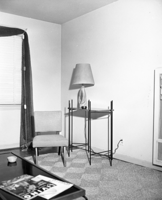 The brown fish net window drapery sets the mood for contemporary furnishings in the home of Mr. and Mrs. Douglas Wixson. Brown, green, red, black with a spot of gray make up the color scheme. Doug made the table shown at right; painted the chair and did a lot of other things that personalized the apartment.
