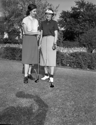Miss Bee McWane, left, of Birmingham and Miss Nell Moody of Sherman who were in one of the championship matches of the Women's Texas Open golf tournament at River Crest. Miss McWane won, 4-3, and is playing Mrs. Babe Zaharias. Published in Fort Worth Star-Telegram evening edition October 24, 1952