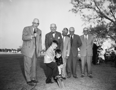 Groundbreaking ceremonies for Fort Worth Children's Museum. Left to Right, J. Lee Johnson Junior, Amon Carter, Mayor Edwards, Joseph H. Patterson and D. R. Rambo all watching Michael Durkin and J. Lee Johnson IV.