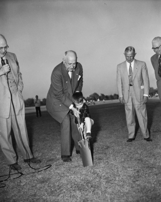 Amon Carter Senior, second left, helping a young boy dig a hole while others look on. This picture was taken at the groundbreaking ceremonies for Fort Worth Texas Children's Museum.