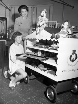 Minnie Malone of Lena Pope Home is shown choosing a game from the Bozo Wagon recently given to the City County Hospital Pediatric ward by members of the Griffin Class of St. Stephen Presbyterian Church. Pushing the cart is Mrs. K. E. Westenhaver, a class member.