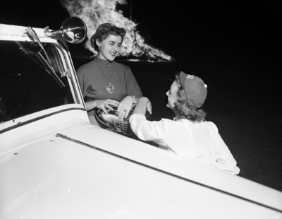 In The Spirit - Perched on a fire truck, two TCU freshmen compare impressions of their first TCU bonfire and pep rally. Mary Carlson, left of San Antonio and Mary Sue Stramler of Houston were among hundreds of students and ex-students who turned out Friday night for the rally.