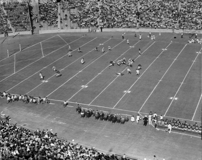 Francis (Cotton) Davidson, Baylor quarter back, connects with a 20-yard pass to Charles Smith, sophomore end, for the first Baylor touchdown in the game with A&M at Waco. Herbert Scott is the Aggie directly back of Smith. Baylor won the game 21-20. Published in Fort Worth Star-Telegram morning edition October 26, 1952.