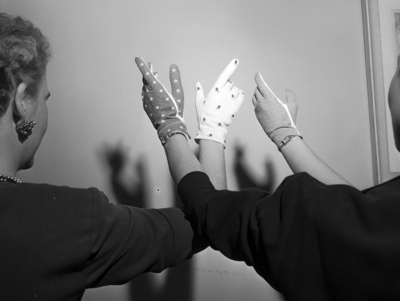 Variety in gloves will be the by-word for spring. Left to right, these Hansen-made gloves are in figured denim with white cotton palms, in white woven cotton with embroidered figure and in checked gingham with white palm. They're being shown at Hotel Texas as part of the National Fashion Exhibitors show.