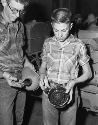 Ranch and Farm Magazine on the 4-H boys in Wichita County. Checking an engine air cleaner, Dick Humber of Shackelford County, left, and Dale Hatcher of Hardeman County found plenty of dirt to remove.