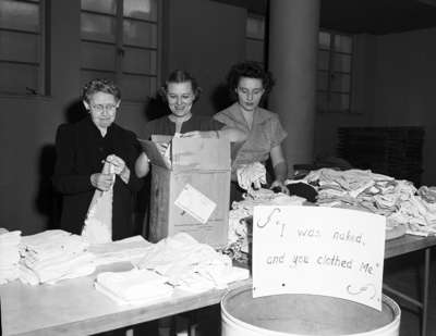 Sorting fabrics which will be sent to those in need overseas are, left to right, Mrs. Nannie Mae Moore, Mrs. Harmon Hightower and Mrs. H. L. Roberts, members of the University of Christian Church's Woman's Christian Fellowship group. A sign in front of the table of clothes reads " I was naked, and you clothed me."