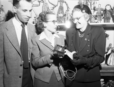 Mearl F. Carson, left, and Miss Elna Wilkinson, center, of the Fort Worth Children's museum receive a fine camera from Miss Agnes Christenberry, right, president of the Administrative Women of Education, donors. Carson is a naturalist for the museum and Miss Wilkinson is a volunteer teacher of photography.