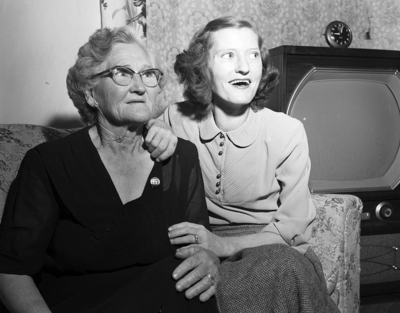 Mrs. P. H. Raspberry, 71, left, an ardent Eisenhower supporter, came here to visit a daughter, Mrs. Roy Mattix, right, to escape the heckling of six children and 27 grandchildren, all Stevenson enthusiasts. Mrs. Mattix is the only other member of the family to boost Ike.
