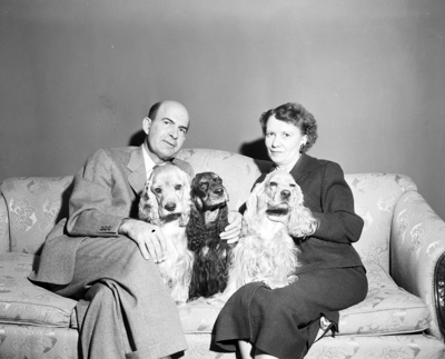 Mr. and Mrs. Reed B. Galloway, have entered their three champion cockers in the Dallas Combined Specialty Show Nov. 16. The dogs sitting between them, left to right, Hi-Tone Townsmen, Hi-Tone Tanya, and Hi-Tone Hildgarde. The Galloways recently moved to Fort Worth from Oklahoma City.