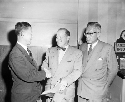 George Francis Hamill of the Civil Aeronautics Administration welcomes Mitsuyoshi Ino, left, and Ichio Imai, members of an 11-man Japan aeronautic technical survey mission, to Fort Worth at Meacham Field Thursday night.