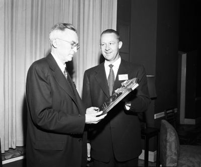 Y. Q. McCammon (left) receives plaque for outstanding service to TCU athletics from Dr. W. W. Summer, president of Ex-Lettermen's Association, at annual meeting here Friday night, October 31.