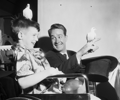 Magician Bill Monk, pulled two doves out of his hat for Bobby McMahon during the annual Jaycee Halloween party in City-County Hospital's Polio ward Friday night, October 31. Bobby is the son of Mr. and Mrs. R. L. McMahon of Weatherford. Bobby is all smiles. There is a dove on his head.